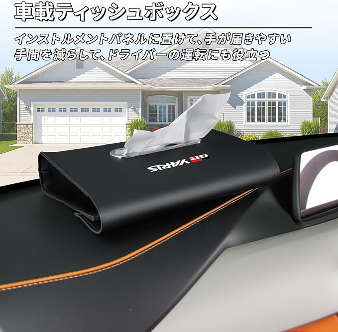 【合理的な設計】この車用ティッシュケースは GR YARiSロゴが印刷されており、高品質な PU レザーで作られているため、上品な質感を持ち、お手入れも簡単です。対応 GR ヤリス 10系 RZ RC 車内のインテリアとスタイルが完璧に調和し、お客様の個性的なニーズに応えます。車内でティッシュが散らかって収納が難しい問題を解決しつつ、車内の美しさと清潔さも向上させます。素材は柔らかく、触り心地が良く、ドライブ中に異音が発生したり、車内のインテリアに傷がつくのを防ぎます。お客様がより便利にティッシュを収納し、スムーズに取り出しできるように配慮されています。