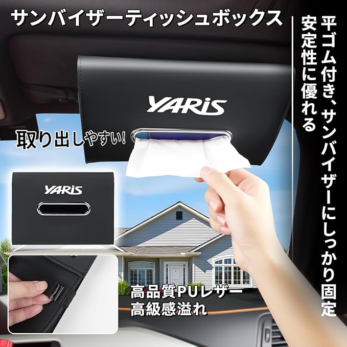 【合理的な設計】この車用ティッシュケースは YARiSロゴが印刷されており、高品質な PU レザーで作られているため、上品な質感を持ち、お手入れも簡単です。対応 ヤリス 新型 ヤリスYARiS X G Z 車内のインテリアとスタイルが完璧に調和し、お客様の個性的なニーズに応えます。車内でティッシュが散らかって収納が難しい問題を解決しつつ、車内の美しさと清潔さも向上させます。素材は柔らかく、触り心地が良く、ドライブ中に異音が発生したり、車内のインテリアに傷がつくのを防ぎます。お客様がより便利にティッシュを収納し、スムーズに取り出しできるように配慮されています。