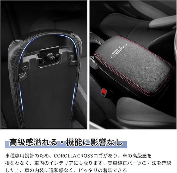 【高品質素材・2色選択可】このアームレストカバーがより良い感触のために高品質のPUレザーを採用し、アームレストを十分に包まれています。そして、弊社のアームレストカバーが異臭もなく、耐摩耗性、耐水性、汗を吸い取る機能があります。二重太い糸の縫製なので、カバーの耐久性が抜群です。車種専用設計のためフィット感良好、 COROLLA CROSS エンブレムがあり、車の高級感を損なわなく、車内のインテリアにもなります。2つのスタイルからお選びいただけますので、お好みに合わせて、ご愛車の内装の雰囲気とマッチします。
