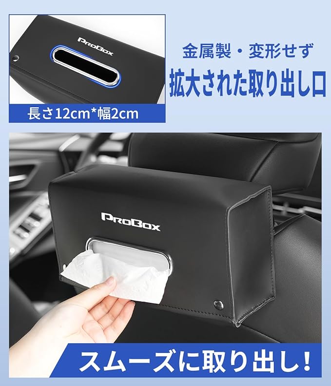 【質感抜群・おしゃれな見た目】この車ティッシュケースは厚手のPUレザー素材で作られており、形状が直立して崩れにくく、質感が非常に優れています。また、この車用ティッシュボックスには金属素材で装飾され、PROBOXのロゴが付き、シンプルでスタイリッシュなデザインでティッシュを隠して車内空間にアクセントを追加します。このティッシュ収納ボックスはプロボックス 50系/160系 NCP160V NSP160V NCP165V 全シリーズに適用します。