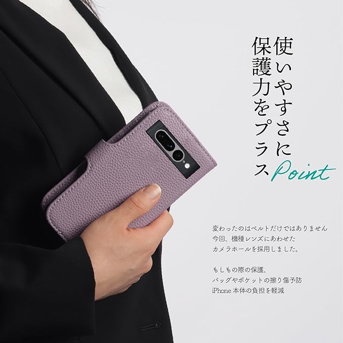 磁石を使わずに開閉がスムーズで、使い心地が良い留めベルトと、動画視聴や通話が快適に楽しめるストレスフリーな操作が便利なスタンド機能を備えたアイテムです。