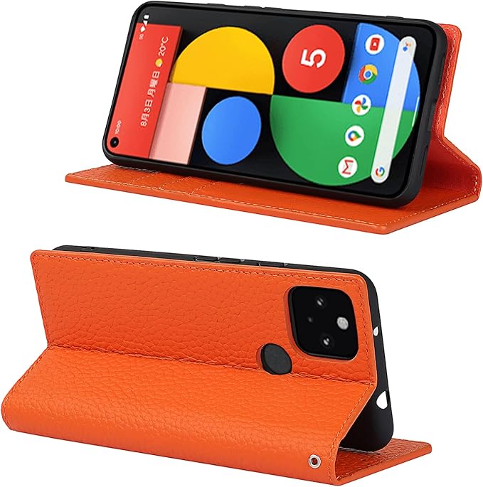 for Google Pixel 5A 5G ケース 本革 本革 for pixel5a 5g 手帳型ケース 財布型 カバー 手帳式 本革 柔らかい 本皮 スプラットホール付き スプラット同梱 内蔵マグネットカード収納 横置きスタンド機能 - オレンジ