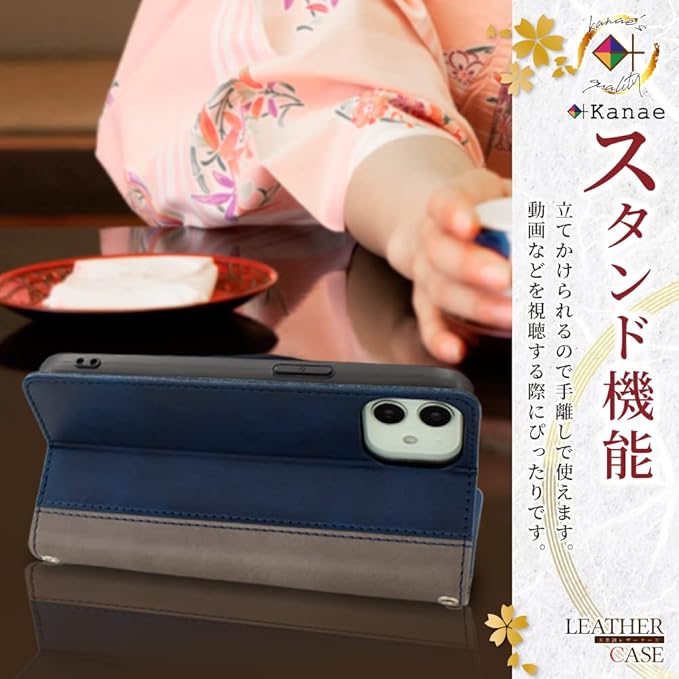 叶kanae カナエ Google Pixel 6a ケース カバー 手帳型 本革調 レザーケース ネイビー グレー 1個入り