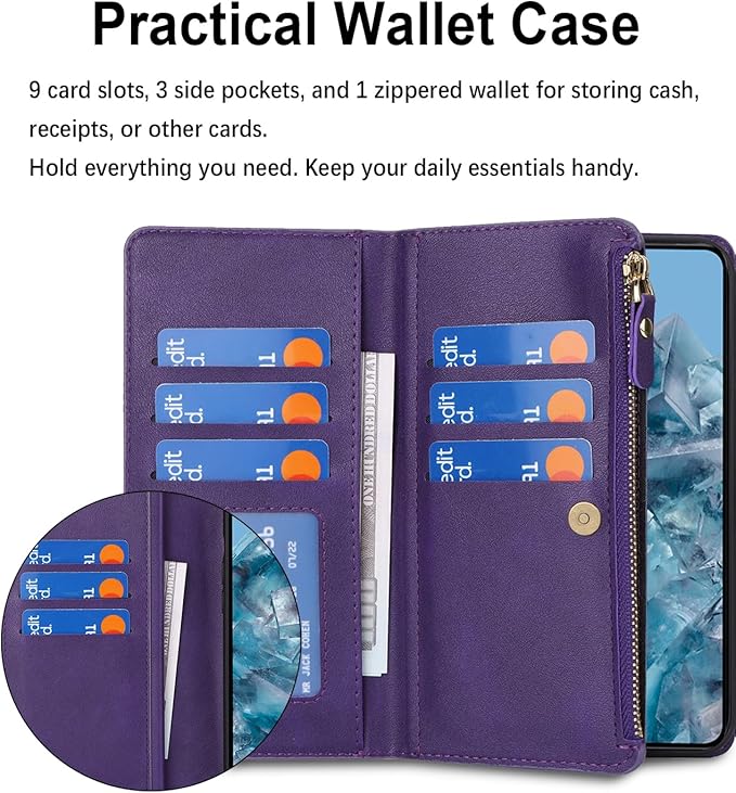 for Google Pixel 8 Pro ケース for pixel 8pro 縄掛けケース for Google Pixel8 Pro 手帳型 財布型 ICカード コインポケット ストラップ付き カード 収納 小銭入れ ファスナーポケット付き PUレザー 6色 パープル