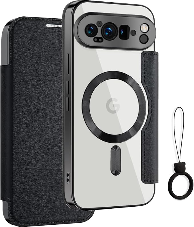 Google Pixel 9 Pro XL 用 ケース 手帳型 かわいい グーグルピクセル9 Pro XL 用 携帯カバー背面 透明 Magsafe対応 おしゃれ 薄型 カード収納 PUレザー 内蔵マグネット 耐衝撃 財布型 カード収納 全面保護 落下保護 耐摩擦スマホケース(クリア,ブラック)