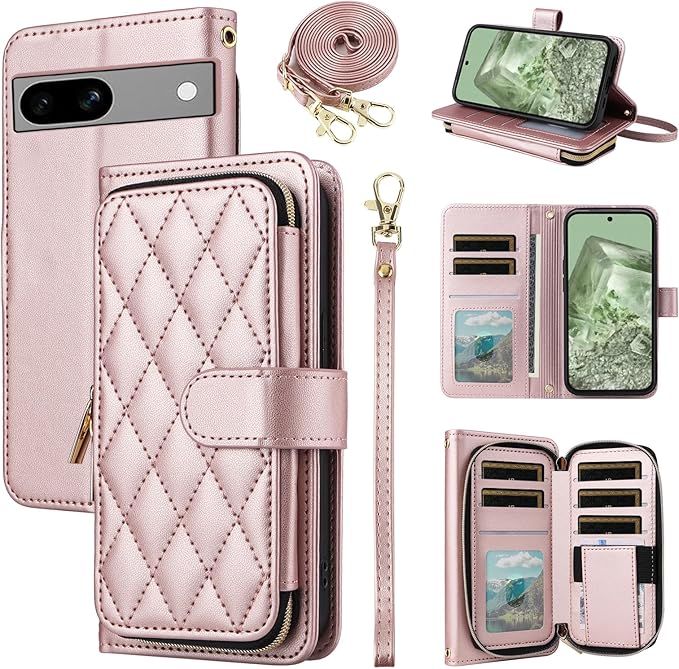 Elisorli for Google Pixel 8A 手首/ショルダーストラップ カードスロット ジッパー財布 豪華 PUレザー スタンド ための 携帯電話のカバー 持つ Pixel8A A8 5G ウォレットケース しい 大人人気 お洒落 ケース 手帳型 スマホケース カバー スマートフォン 耐久性 耐衝撃 フラップ ストラップホール カード収納 女 ローズゴールド