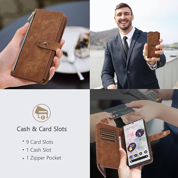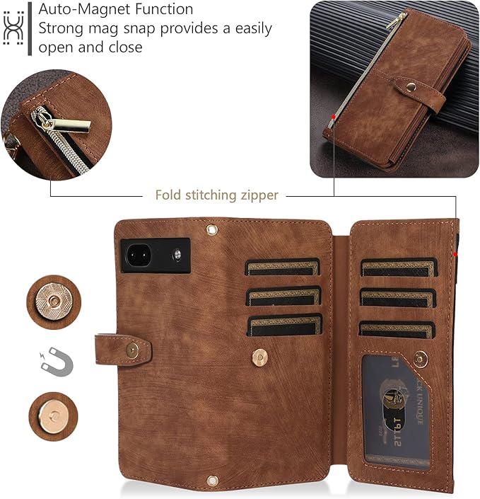 UEEBAI ケース 対応 Google Pixel 7a 5G 用の ケース かわいい ジッパー付き携帯電話ケース 高級PUレザー 携帯カバー おしゃれストラップ付き ハンドメイド ケース カード収納手帳型ケース マグネット式 財布型スマホケース スタンド機能 手帳型ケース 軽量 耐衝撃 全面保護ケース 人気ケース-ブラウン