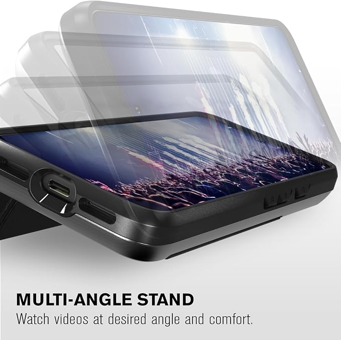 [マルチアングルマグネットロックスタンド]ケース背面の折りたたみ可能なレザーフラップはキックスタンドとしても機能し、お好みの角度でビデオを視聴できます。