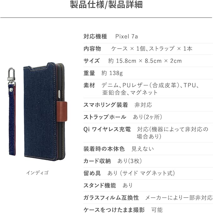【製品仕様】… ◆ 対応機種 : Google Pixel 7a ( グーグル ピクセル7a / Pixel7a ) ◆ 内容物 : ケース 1個、ストラップ 1本 ◆ サイズ : 約 15.8cm 8.5cm 2cm ◆ 重量 : 約 138g ◆ 素材 : デニム、PUレザー(合成皮革)、TPU、亜鉛合金、マグネット