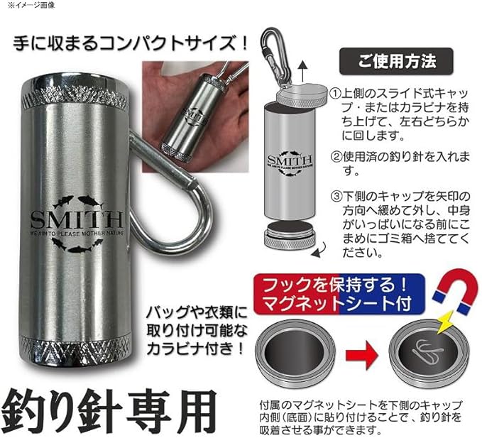 スミスマグネットフックボトル(MGフックボトル)■サイズ:横2.6/縦6.2cm 交換フックの収納に最適なアイテム!フックを保持するマグネットシート付で、ロデオクラフトの松本幸雄氏も愛用されています。