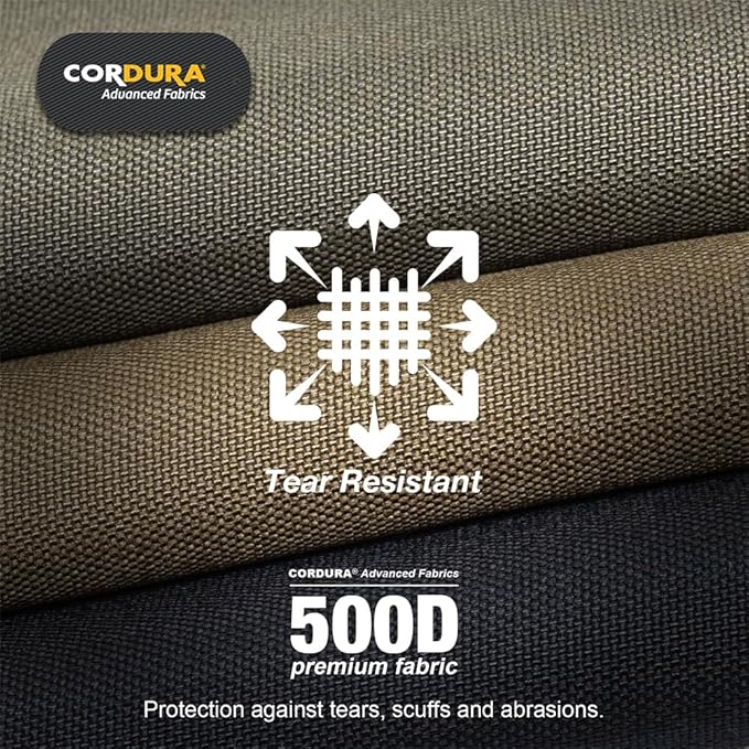 500D 高品質ナイロン、高耐久性:500D CORDURA ナイロン素材を採用し、優れた防雨・防泥・耐磨耗性能を備えています。過酷な環境下でも劣化しにくく、長時間アウトドアで使用しても形崩れや破損を防ぎ、安心して継続して使用できます。