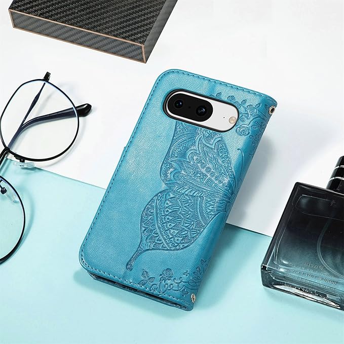 Google pixel 9/Pixel 9 Pro ケース 手帳型 グーグルピクセル9 ケース 財布型 カード収納 かわいい 蝶々 フラワー柄 シンプル おしゃれ ドコモ Google pixel9 手帳型ケース 良質 革 レザー マグネット式 Pixel9 Pro 携帯ケース 横置きスタンド機能付き ピクセル9 プロ スマートフォンケース 耐衝撃 ストラップホール付 (ブルー)