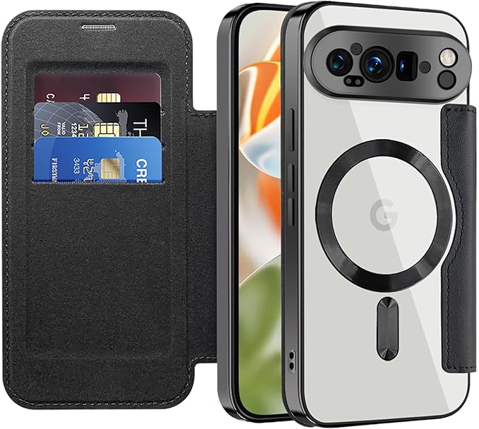 Google Pixel 9 Pro 用 ケース 手帳型 かわいい グーグルピクセル9 Pro 用 携帯カバー背面 透明 Magsafe対応 おしゃれ 薄型 カード収納 PUレザー 内蔵マグネット 耐衝撃 財布型 カード収納 全面保護 落下保護 耐摩擦スマホケース(クリア,ブラック)