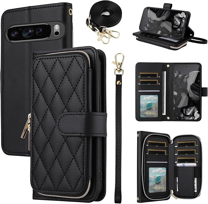 Elisorli for Google Pixel 9 Pro XL 手首/ショルダーストラップ カードスロット ジッパー財布 豪華 PUレザー スタンド ための 携帯電話のカバー 持つ Pixel9 9Pro 9ProXL Nine ウォレットケース しい 大人人気 お洒落 ケース 手帳型 スマホケース カバー スマートフォン 耐久性 耐衝撃 フラップ ストラップホール カード収納 女 ブラック
