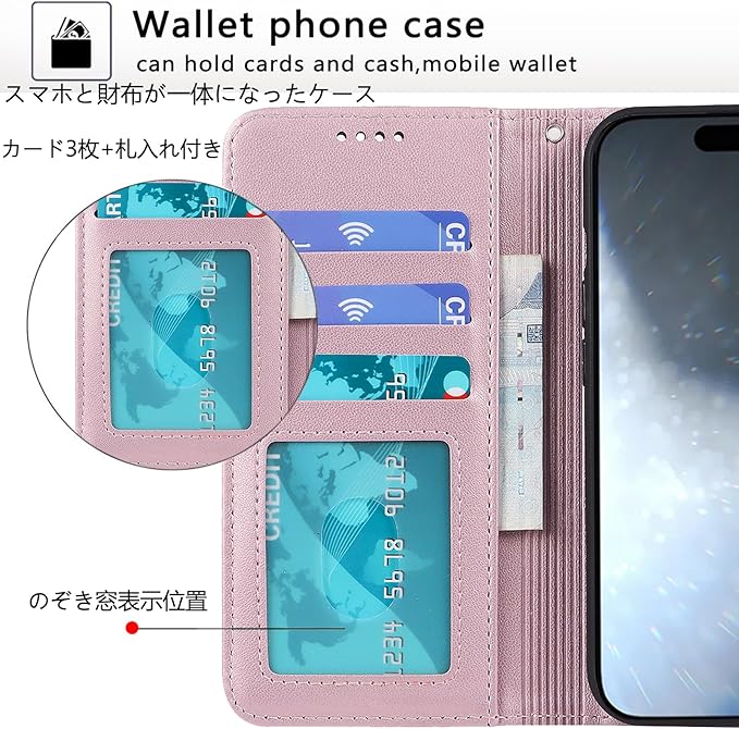 【カード収納&マグネット式】:窓ソケット+サイドポケットでカード最大3枚を収納可能。磁石をフープの留め具部分に配置することで、カードへの磁気影響を低減、ケースの閉じ付け力を強化。