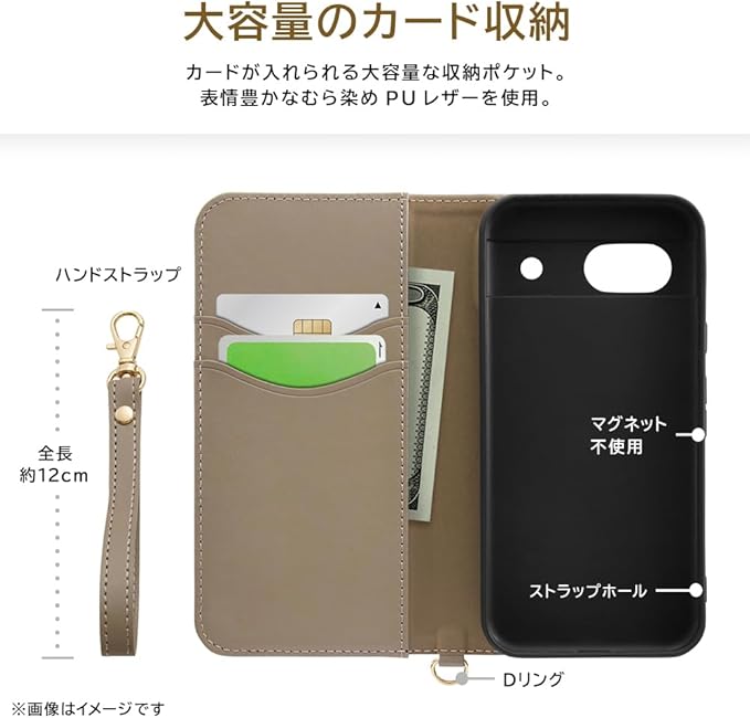 カードが入れられる大容量な収納ポケット。マグネット不使用で端末や磁気カードも安心。ハンドストラップ付き。動画視聴などに便利なスタンド機能付き。