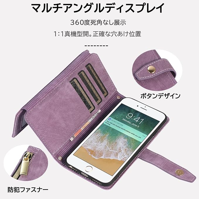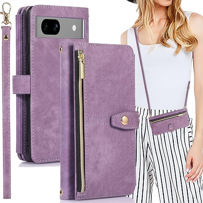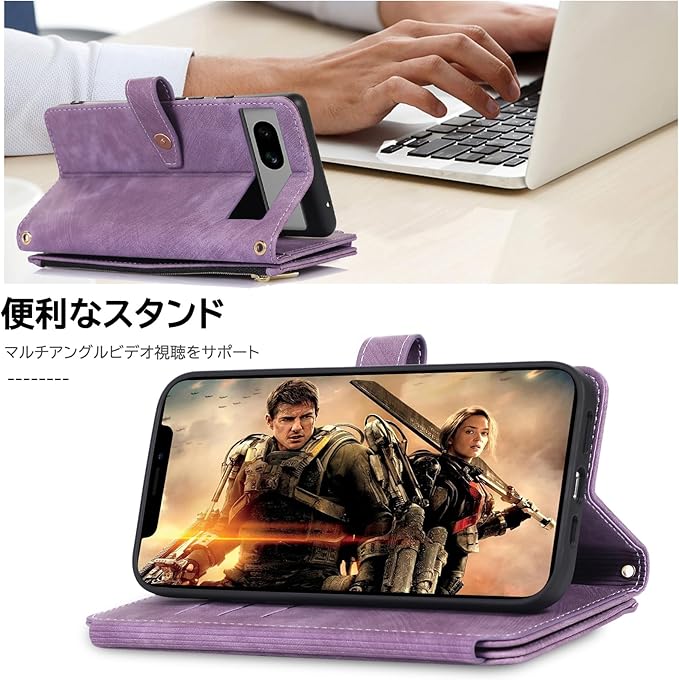 Pixel 8Aケース 手帳型 グーグル ピクセル8a ケース 手帳型 つや消し肌感レザー Pixel 8A携帯カバー マグネット開閉 Pixel 8A カバー 多機能 収納 財布カバー ピクセル 8a ケース カード入れ サイドジッパー 横置きスタンド機能 ケース 縄掛け/肩掛け 保護カバー 全面保護防塵耐衝撃横開き 滑り防止 (パープル)