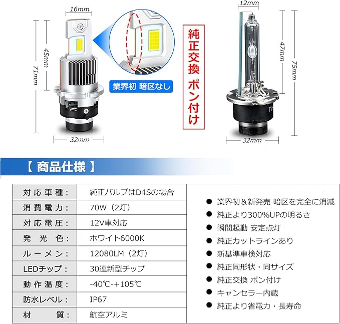 業界初、新発売モデル、暗区なしの D4S LED ヘッドライト 純正と同じな配光:当該製品は革新的なエッジで切り口を設計されており、暗区を完全に解消され、プロジェクター式のレンズで綺麗なカットラインが出て、暗区なし、新基準車検対応可能です。多くの市販品はライトボードが厚くて、エッジも厚くて、暗区がさらなる拡大で、走行中、どうしても気になる暗区が出ます。