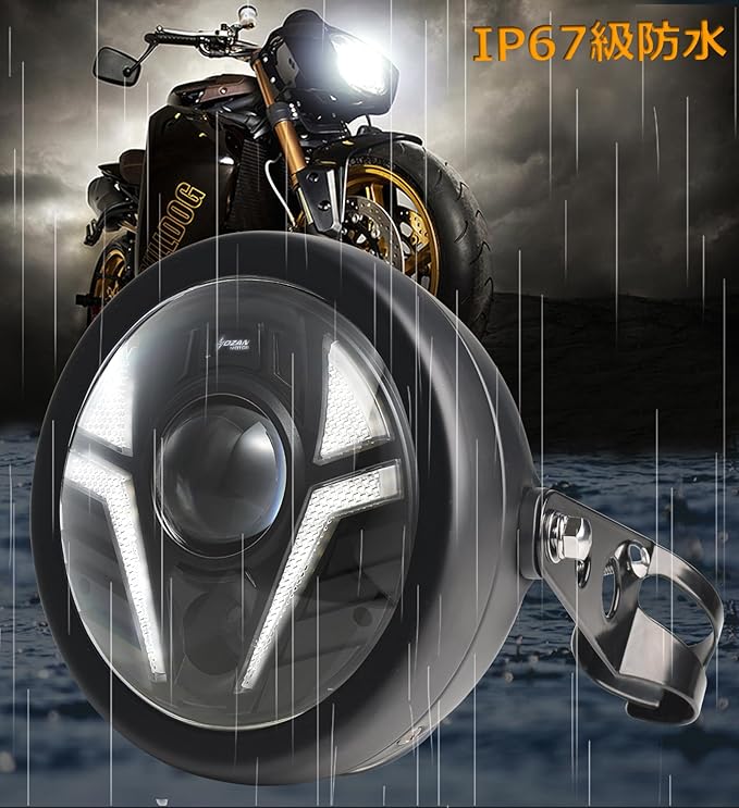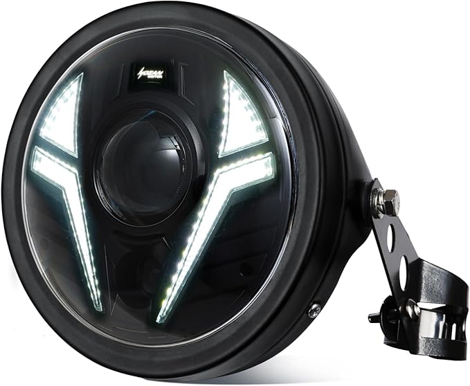 7インチLED オートバイヘッドライト 超遠補助スポットライト ホワイトDRL アンバーターンシグナル ヘッドライトハウジングバケットマウントブラケット付き バルカンカスタム CB400 CB1300 XS650 チョッパーカフェレーサーボッベに対応