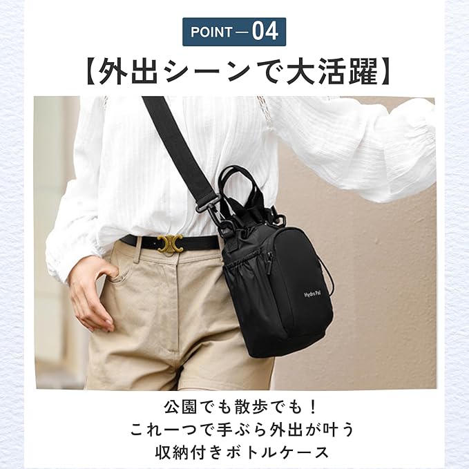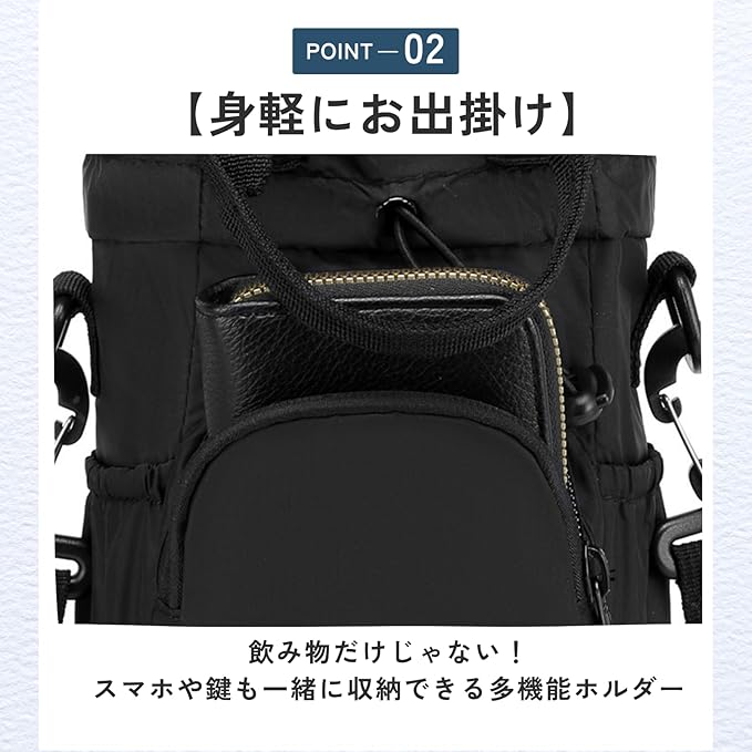 【多機能ボトルホルダー】冷たい飲み物も温かいお茶も長時間キープできる万能ボトルケース【身軽にお出掛け】飲み物だけじゃない!スマホや鍵も一緒に収納できる多機能ホルダー【撥水ナイロン採用!】軽くて丈夫、撥水加工で天候を気にせず使えるボトルホルダー【外出シーンで大活躍】公園でも散歩でも!これ一つで手ぶら外出が叶う収納付きボトルケース