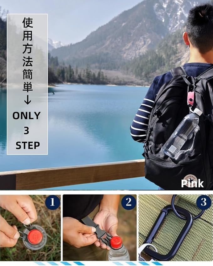 【モバイル水分補給ソリューション】** ・ハイキング中にバックパック外側でクイックアクセス。 ・サイクリング時にフレームにセットして振動防止。 ・キャンプサイトでテントポールに吊り下げ即席給水ステーションに。