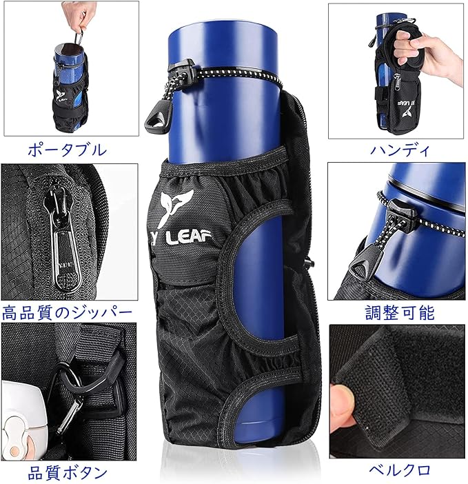 【超大容量・多様対応】500ミリリットルペットボトルから1リットルボトルや水筒、折りたたみ傘なども収納できるペットボトルホルダーです。
