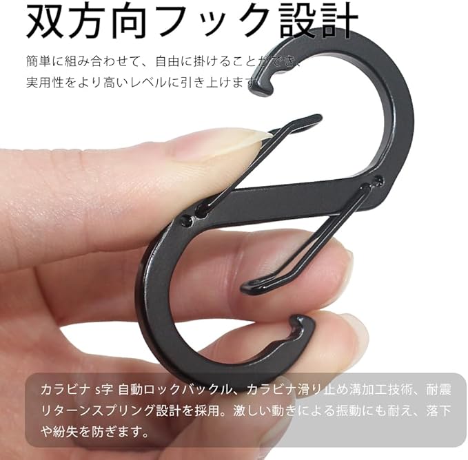 双方向フック設計:カラビナ s字 自動ロックバックル、カラビナ滑り止め溝加工技術、耐震リターンスプリング設計を採用。激しい動きによる振動にも耐え、落下や紛失を防ぎます。