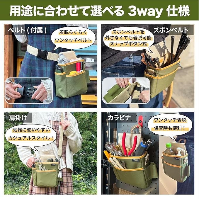 【多機能3WAYツールポーチ】ストラップによる肩掛け、ベルトへの取付(ベルト付属)、カラビナによる吊り下げなど使用シーンに応じてお好みで使い分けができます。ベルトへの取付はスナップボタン式を採用しておりベルトを外さずに着脱が可能! ズボンベルトへの取付、付属ベルトでの取付どちらにも対応します。