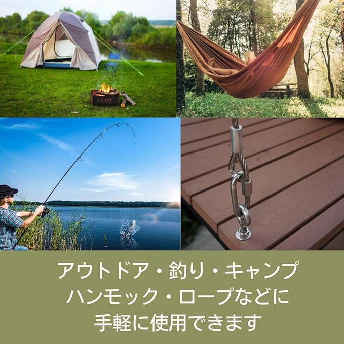 【手軽に使える】操作が簡単なワンタッチ取り付けで、日常生活やアウトドア活動において幅広く利用できる便利なツールです。この製品は、キー、ケトル、バックパック、ロープなど様々なアイテムを手軽に接続するのに最適です。例えば、キャンプ場で重いバックパックをしっかりと固定したり、釣り用具をまとめて持ち運ぶのが非常に便利です。また、遮光ネットや腰道具、ブランコの取り付けにも適しています。