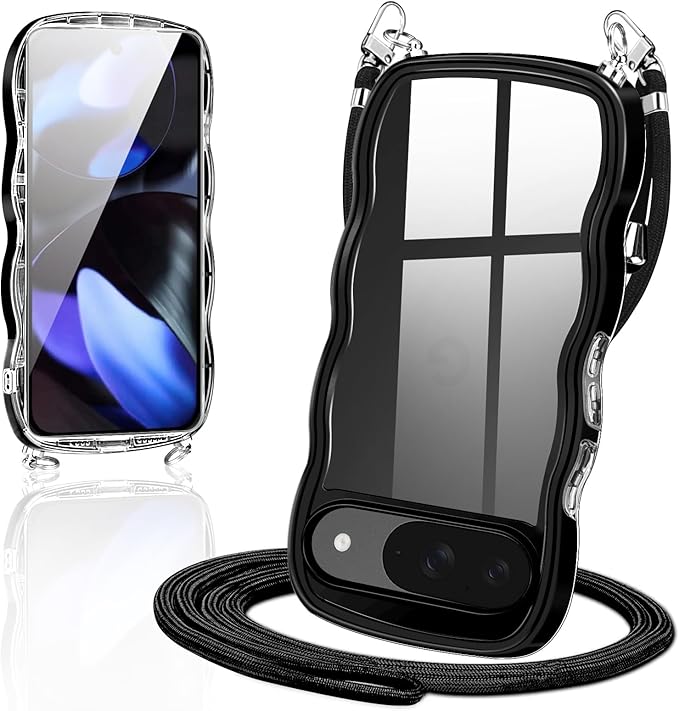 Google pixel10 /pixel 10 pro 用の ケース ショルダー クリア なみなみ TPU ピクセル10/10pro スマホケース カバー 創意 個性 肩掛け 首掛け 斜めかけケース 可愛い かわいい 韓国 透明 耐衝撃(ブラック)