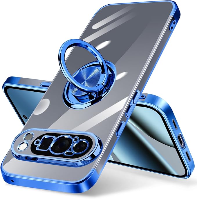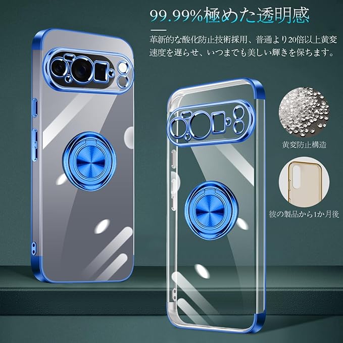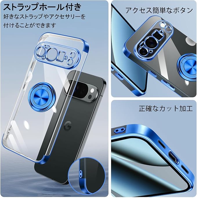 Google Pixel 10 Pro XL ケース リング付き クリア Pixel 10Pro XL ケース 耐衝撃 スタンド機能 ストラップホール付き 軽量 スリム ソフト TPU ピクセル 10pro xl カバー 透明 TPU 擦り傷防止 落下防止 (ブルー)