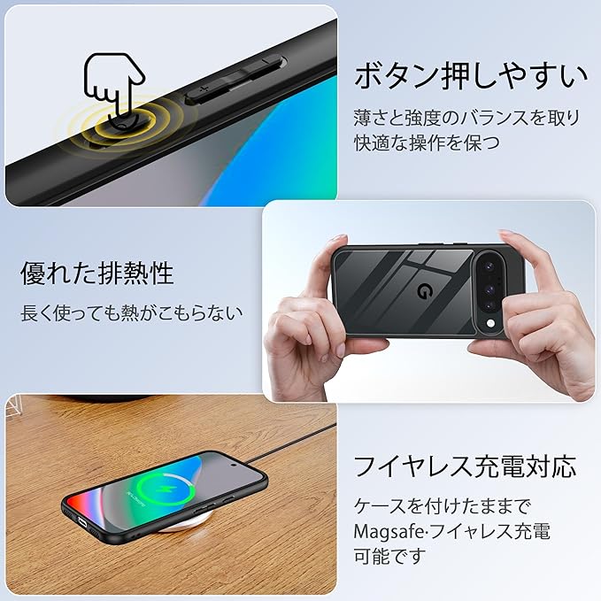 【軽量・フィット感も満点】グーグルピクセル10/10proクリアケースの保護性能を保ちながら、スマートさを損なわないよう、薄さと強度のバランスを取り、手にフィットする程よい厚みで、快適さが保ち、手に持ったときの負担もかかりません、最適な設計で作り出す。滑り止め加工したケースは持ちやすく滑りにくくて取り扱いはしやすいです。装着・脱着も簡単になります。