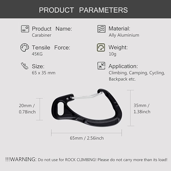 【最大安全強度】約45kg(縦軸方向)強度範囲以内でご使用ください。このカラビナは登山用ではございません。クライミング&登山専用釦として利用できません。