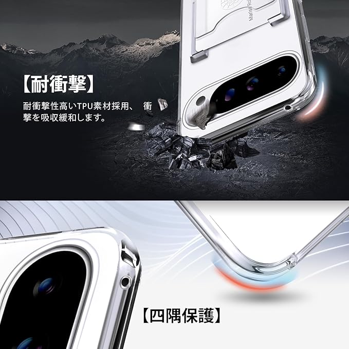 Rockaway 互換性 Google Pixel 10/10 Pro用 ケース カード収納 背面ポケット リング付き スタンド機能 耐衝撃 透明 TPU スマホケース- クリア