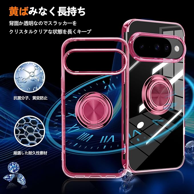 QOUNVYW 対応 Google Pixel 10 用 ケース Pixel 10 Pro 用 ケース リング付き クリア 耐衝撃 スタンド機能 透明 TPU 車載ホルダー対応 落下防止 防塵 薄型 軽量 一体型 変形防止 保護カバー ピクセル 10/ピクセル 10 Pro 用 カバー ピンク W-YXZH-86-05