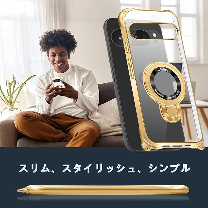 Google Pixel10 Pro XL ケース クリア ショルダー 透明 グーグルピクセル10 pro xl カバー リング付き pixel 10 pro xl カバー スタンド機能 マグネット搭載 耐衝撃 米軍規格 紐付き 斜めがけ 織りストラップ付き ネックストラップ ショルダー 縦/横 2WAY 長さ調整可能 取り外し可能 落下防止 紛失防止(ゴールド)