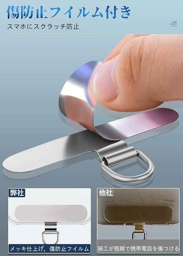 【ストラップホルダー製品特徴 傷防止フィルム加工】素材 :ステンレス製 ◆ 耐荷重:10㎏までの荷重量に達します◆ 対応機種 : SMART PHONE スマートフォン 各種◆ 傷防止フイルム付き、スマホにスクラッチ防止◆デザイン、色が多様で選択可能◆丈夫性・耐久性を強化,本スマホホルダーは高品質なステンレス素材で作り、耐久性や丈夫さが優れて◆曲がれ設計で浮きにくい ◆極薄設計0.4mm,スマホとケースの間に挟んだままに、何かの装着しないような体験をさせていただき、スマホホルダーが極薄設計なので、スマホが浮き上がる問題点と互換性をご心配しないでください