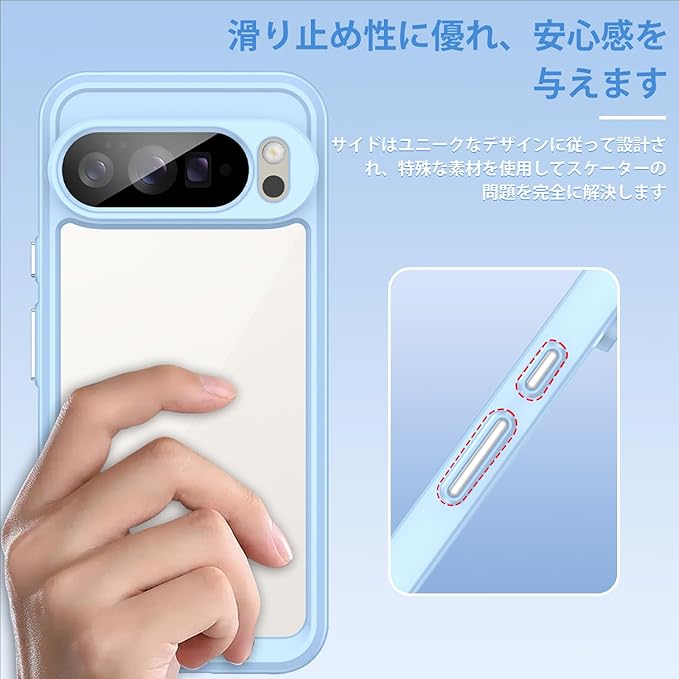 「黄ばみ防止」ケースの側面は単色のTPU素材で作られており、耐久性があり、色が変化したり変形したりしにくいです。背面パネルは、酸化防止加工を施した透明PC素材を採用。黄ばみを防ぎ、長期間使用しても透明感を保ちます。表面には疎油性コーティングが施されており、指紋や油汚れ、汗染みがつきにくく、爽やかな手触りです。