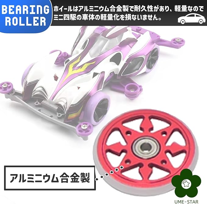 ローラーはプラスチック製のリングがついており、コースとの摩擦を軽減しやすくなっています。 ホイールはアルミニウム合金製で耐久性があり、軽量なので、ミニ四駆の車体の軽量化を損ないません。