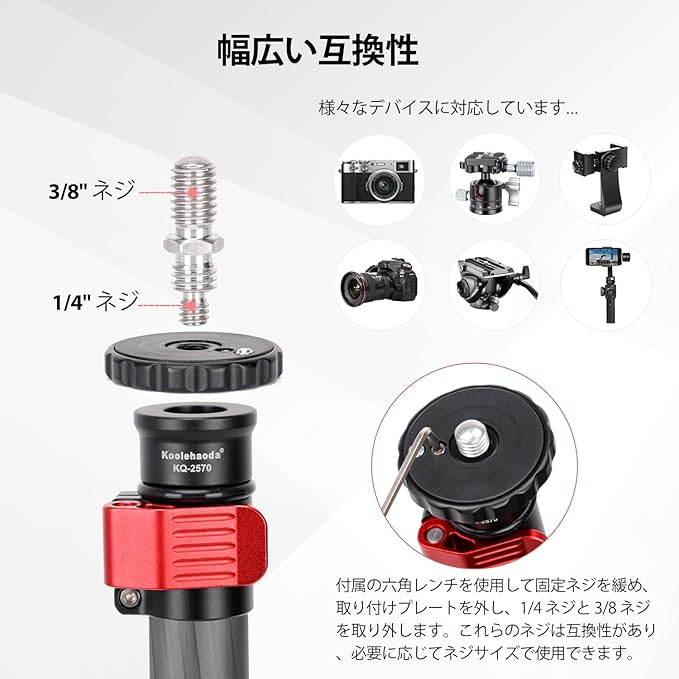 【幅広い互換性】ほぼすべてのカメラ、ビデオカメラ、ボールヘッド、ウェブカメラ、マイク、電話マウント、モニター、ジンバルスタビライザーなどを取り付けるためのリバーシブル 1/4 ~ 3/8 ネジ付きのユニバーサル取り付けプレート。底部には 3/8 ネジ穴があり、 1/4~3/8ネジアダプターが付属しており、三脚に接続して高さを高めることができます。