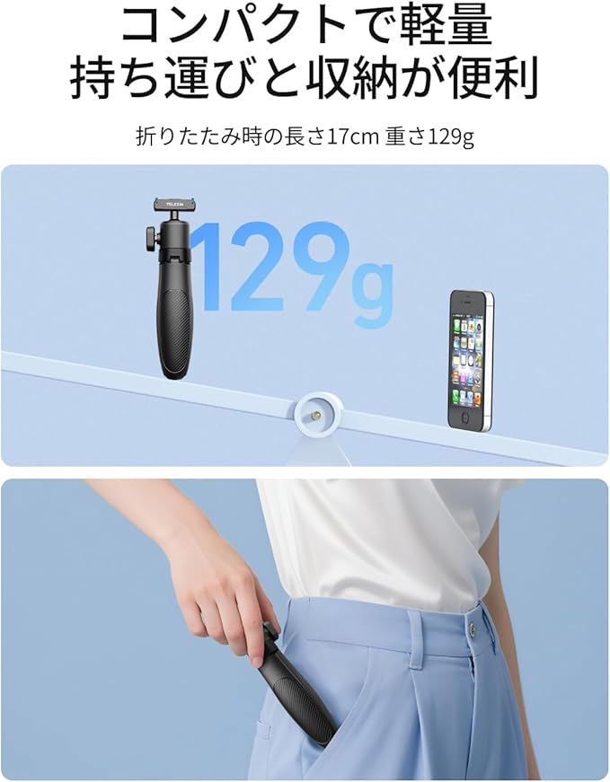 【超軽量ポータブル設計】 わずか129gの軽量設計で、折りたたみ時の長さは17cm。バックパック、ポケット、カメラバッグに簡単に収納可能。日常の移動、アウトドア冒険、旅行撮影など、あらゆるシーンで持ち運び可能です。コンパクトなサイズと軽量設計の完璧な組み合わせで、いつでもどこでも素晴らしい瞬間を捉えることができます。