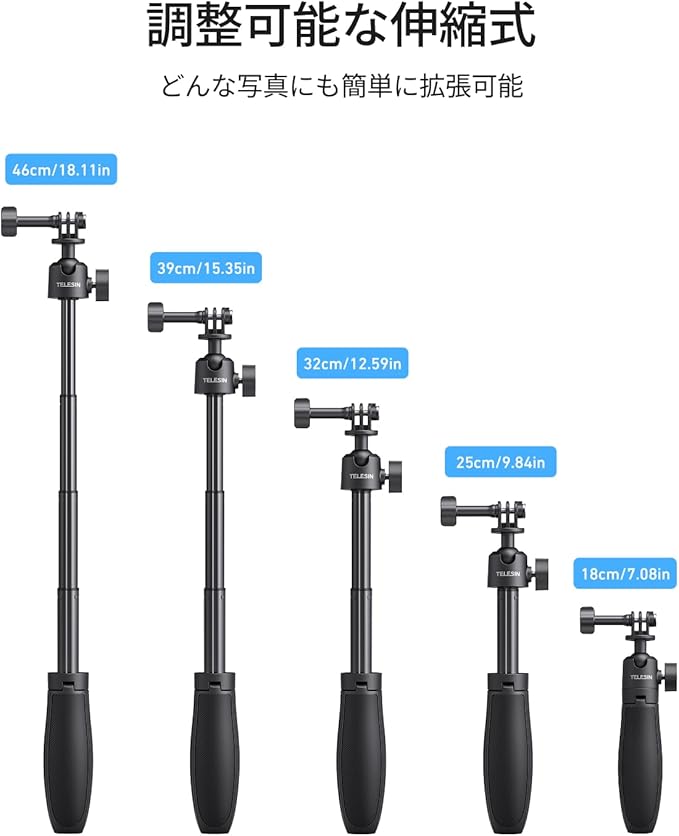 TELESIN GoPro/DJI Action/Insta360 用 ミニ延長ロッド 三脚マウント 46cm自撮り棒 アクションカメラアクセサリー 360 回転 縦撮り対応 一脚 卓上三脚 軽量 セルカ棒 折りたたみ 4段伸縮 vlog撮影 小型で持ち運びに便利 DJI Osmo Action 6/5 Pro/4/3 Insta 360 Ace Pro 2/ Ace Pro アクセサリーに対応