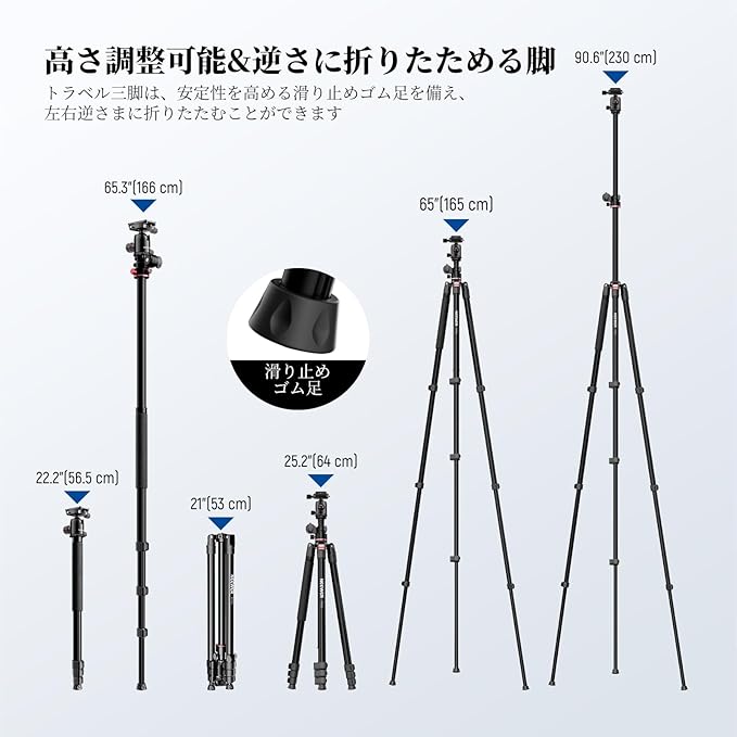 【高さ調節可能&逆折り脚】トラベル三脚を使えば、撮影環境を手軽にカスタマイズできます。3段階の脚角度調節機能を備え、高さは64cm-165cmまで調整可能です。センターコラムを上下させることで、最大230cmまでの高さまで調整できます。三脚の脚は逆方向に折りたたむと53cmとコンパクトになり、バックパックに簡単に取り付けられ、アウトドア撮影にも最適です。滑り止めゴム足が様々な地面で安定性を向上します。