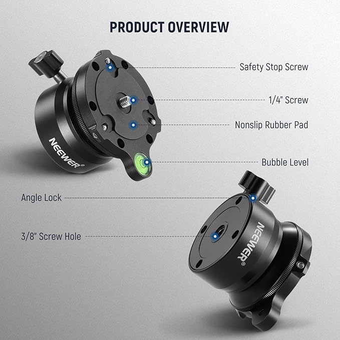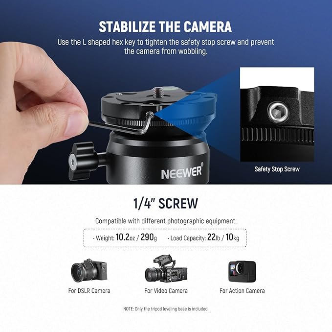 【15 /+15 高速レベリング】レベリングベースは、-15 /+15 の範囲内でカメラをスムーズかつ正確に水平にしたり、凹凸のある表面でも360 パンしたりできます。アップグレードされたネジノブでレベリングベースを素早く固定し、L字型六角レンチを使用し六角ネジを締めることで、取り付けられたデバイスをさらにロックすることができます。