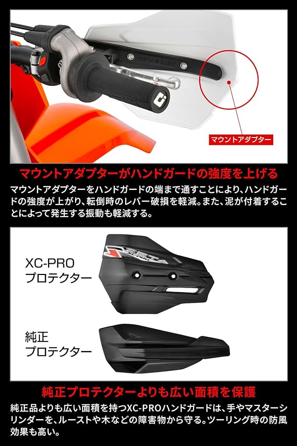 純正品よりも広いガード面積を持つXC-PROハンドガードと、単体でも使用可能なマウントアダプターのセット。