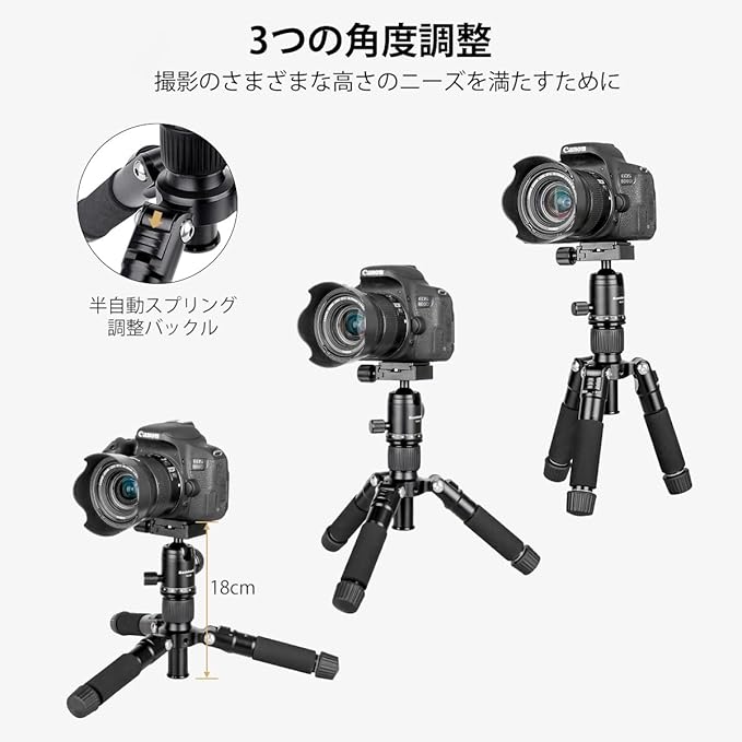 三脚の最小高さは18cmです、より小さく、より軽く、より近い距離でのマクロ撮影に最適です。地上レベルの撮影を行うためのソリューションでもあります。