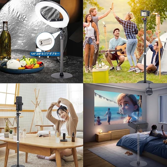 この丸型ベース伸縮式スタンドは、デスクトップ、オフィス、スタジオなど、平らで頑丈な場所であればどこでも使用できます。かさばるスタンドや三脚に代わる、カメラ、マイク、ライト、モニターを支えるための、ワンストップで転倒防止、そしてスタイリッシュな代替品です。