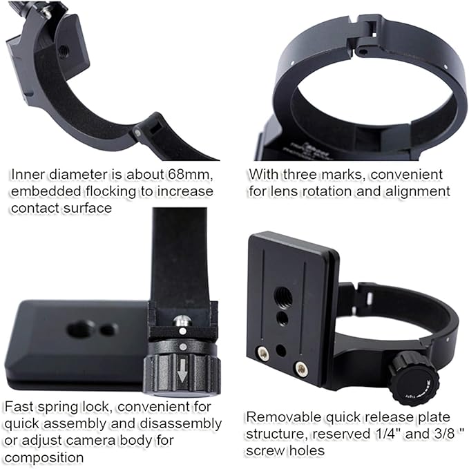 3. 内径は約68mm。植毛層を内側に埋め込み、抵抗を増やします。 レンズの位置合わせを簡単にするための3つのマーカーがあります。 スプリングロックを使用すると、三脚リングを簡単に取り外したり。 1/4および3/8のネジ穴が予約された取り外し可能なクイックリリースプレートがあります。