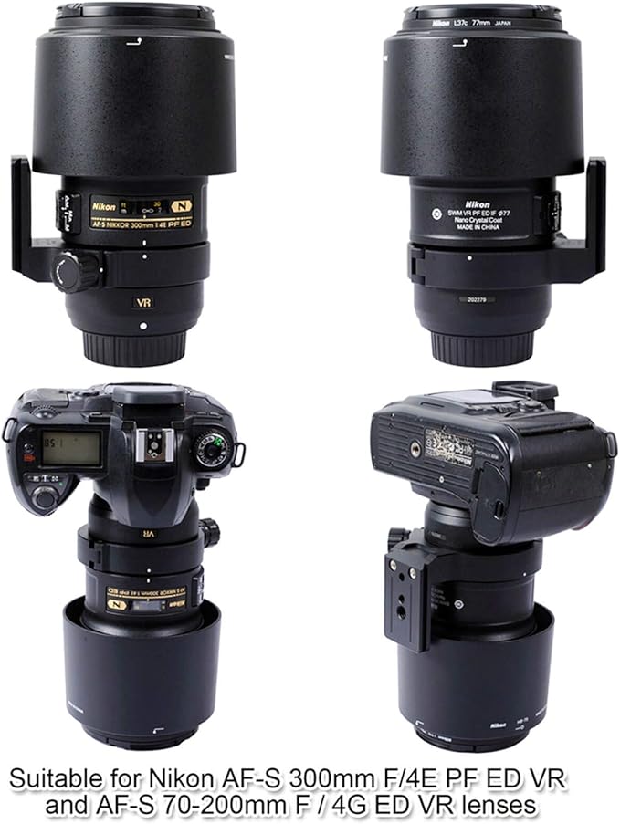 このレンズブラケットはニコン Nikon AF-S NIKKOR 300mm f/4E PF ED VR Lens と Nikon AF-S NIKKOR 70-200mm f/4G ED VR レンズのために特別に設計。他のレンズとの併用はできませんので、使用範囲外のレンズは購入しないでください。