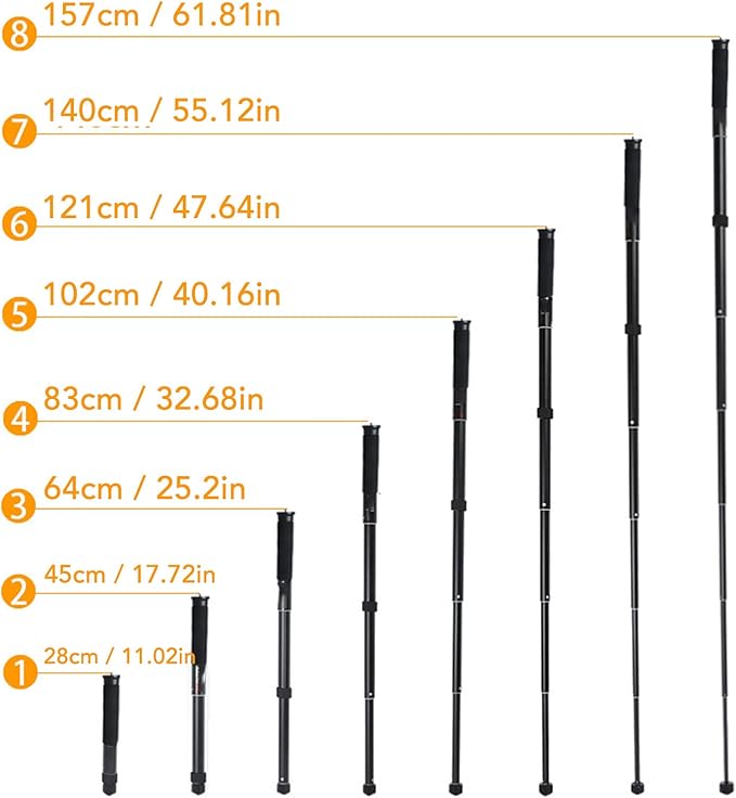 柔軟な拡張:ノブ調整をサポートし、カメラ一脚は28cmから157cmまで延長でき、自撮り棒、トレッキングポールなどとして使用できます。